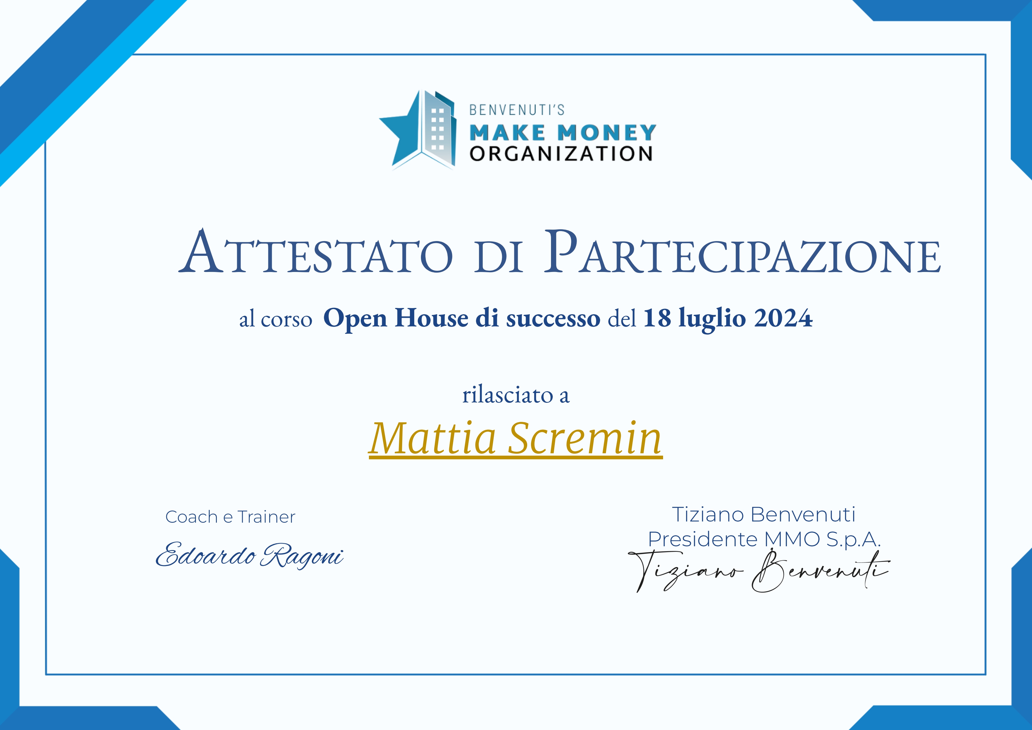 Attestato di partecipazione al corso Open House di successo